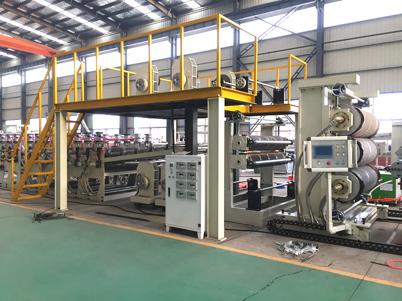 Виробнича лініяКомпозитна головка матриці має Т-подібну структуру та виготовлена з прес-форми P20 із шорсткістю поверхні каналу потоку Ra 0,05 мкм. Головка матриці має дев'ять зон нагріву, потужність нагріву 27 кВт і максимальну робочу ширину 1300 мм, що дозволяє точно контролювати товщину і площинність основного шару екструдованого ПЕ. Трьохвалковий каландр має ефективний розмір робочої поверхні 500 × 1500 мм. Швидкість лінії можна точно регулювати від 0,5 до 8 м/хв за допомогою системи регулювання швидкості ABB, що забезпечує гладку поверхню листа.