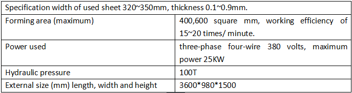 Технічний параметр машини для посіву розплідника Специфікація ширини використовуваного листа: 300~320 мм, товщина: 0,8~2 мм. Площа формування (максимальна): 400 * 600 мм, продуктивність роботи 15 ~ 20 разів / хвилину. Використовувана потужність: трифазна чотирипровідна 380 вольт, максимальна потужність 25KW Гідравлічний тиск: 100T Зовнішній розмір (мм) довжина, ширина та висота) 3600 мм * 980 мм * 1500 мм