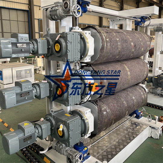 Найважливішою частиною обладнання для задньої панелі з м’якого ПВХ Turble є тривалкова формувальна машина, яка має два гладких ролика та валик із панцира черепахи посередині. Процедури обробки валика з панцира черепахи включають: грубе точіння, динамічне балансування, тонке точіння, шліфування, гальванічне покриття, гравірування, глазурування та тонке дзеркальне шліфування. Час для гравірування валика відносно довгий, тому цикл доставки всього обладнання є відносно довгим. Виробники, яким необхідно обробити та налаштувати обладнання для панцирів черепах, повинні робити замовлення заздалегідь.