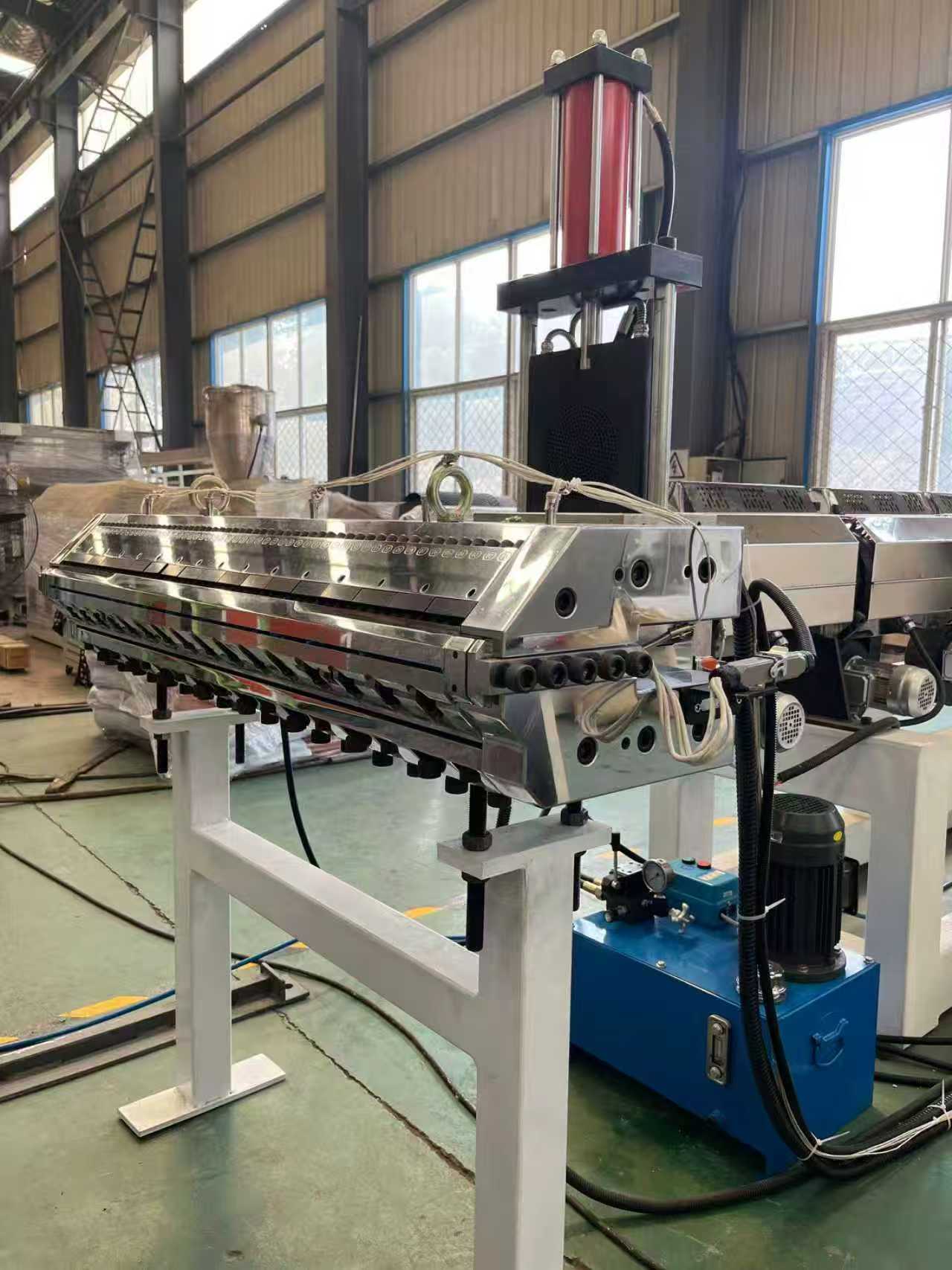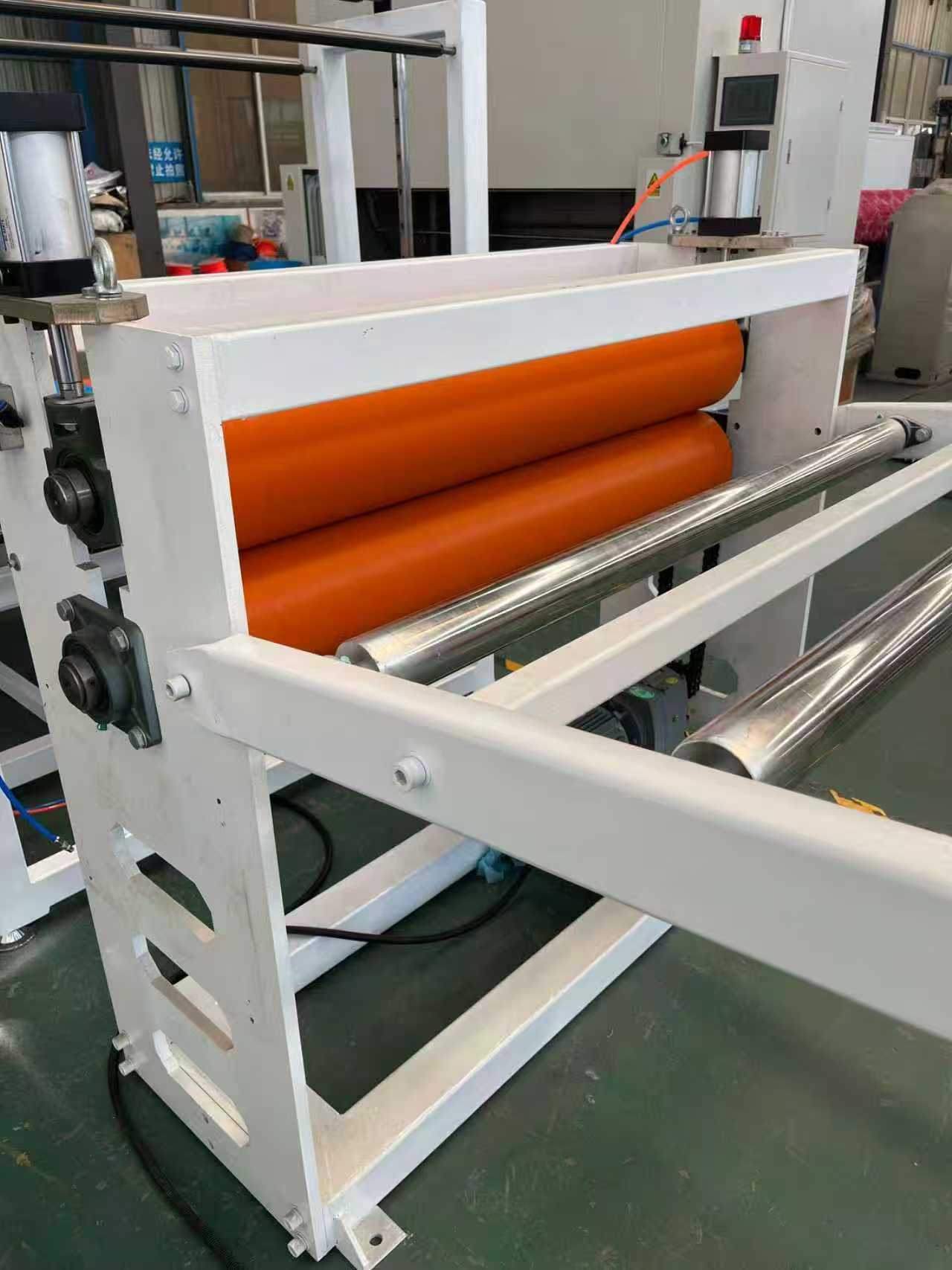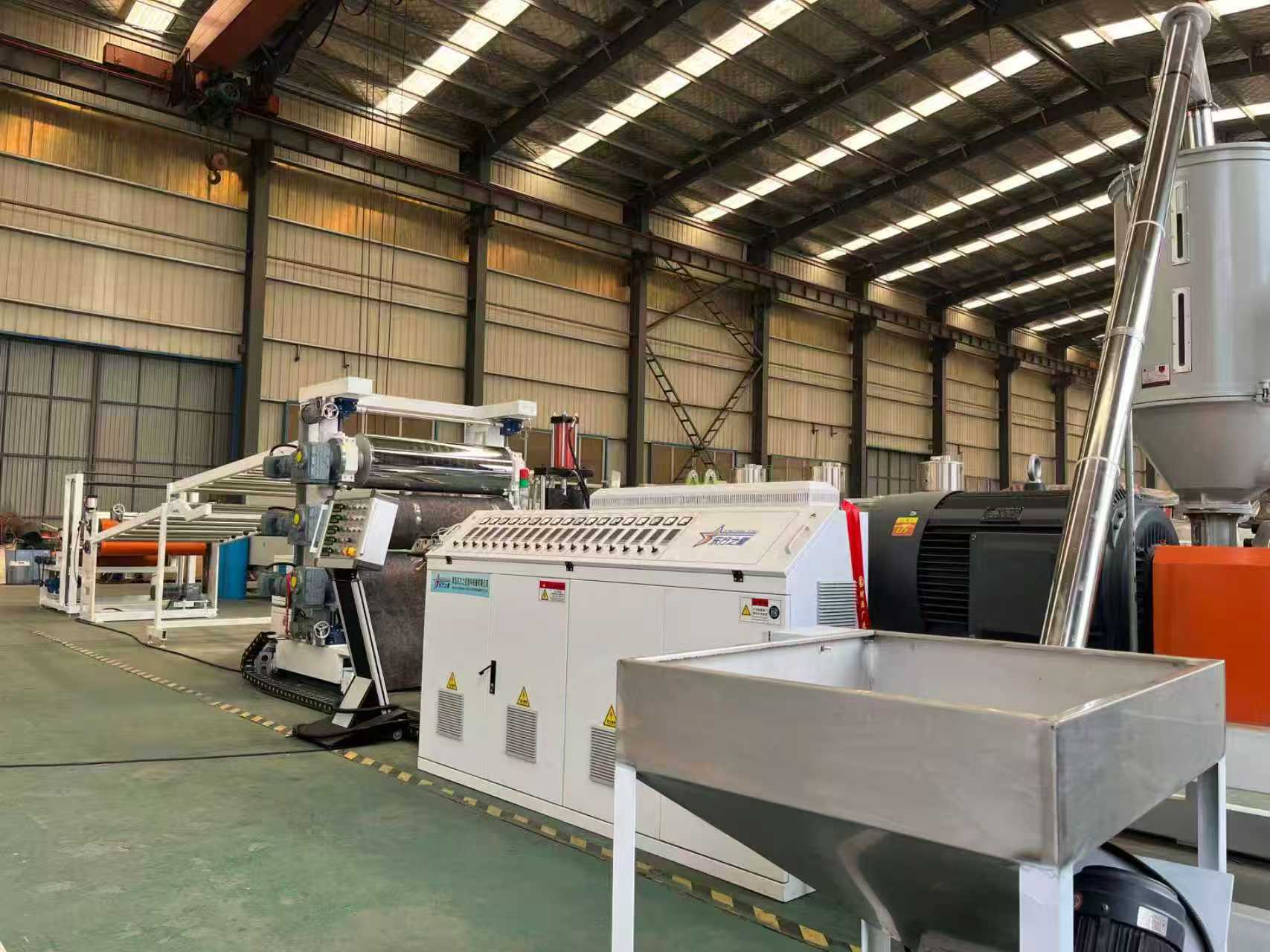 Обладнання протиковзких килимків TPE-1000 мм Автомобільні килимки: Обладнання в основному складається з одногвинтового екструдера, тривалкового каландра, 6-метрового охолоджувального кронштейна, тягової машини з гумовими роликами, ножиці та конвеєрної стрічки.
